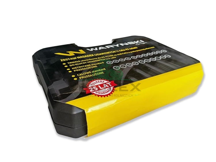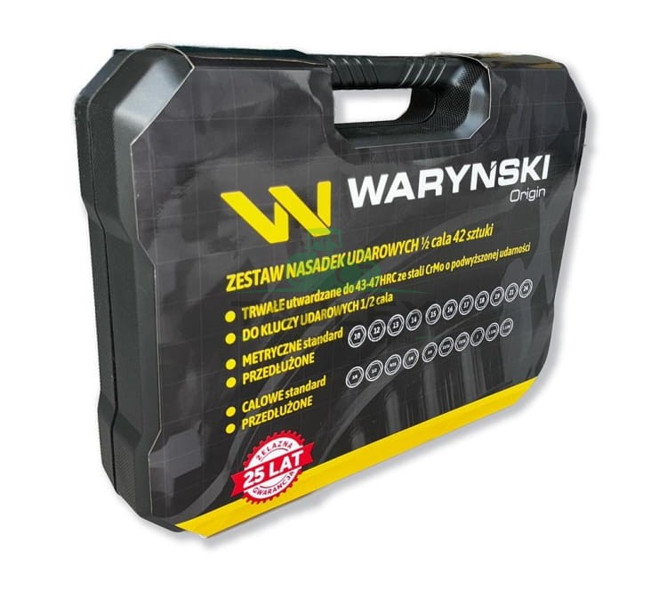Zestaw nasadek udarowych 1/2 " metrycznych i calowych sześciokątnych 42 nasadek standardowch i przedłużanych rozmiary 10 11 12 13 14 15 16 17 18 19 21 24 mm i calowe 3/8", 1/2", 9/16", 5/8", 3/4", 13/16", 15/16", 1", 1-1/16" & 1-1/18" ze wzmocnionej stali CrMo Waryński
