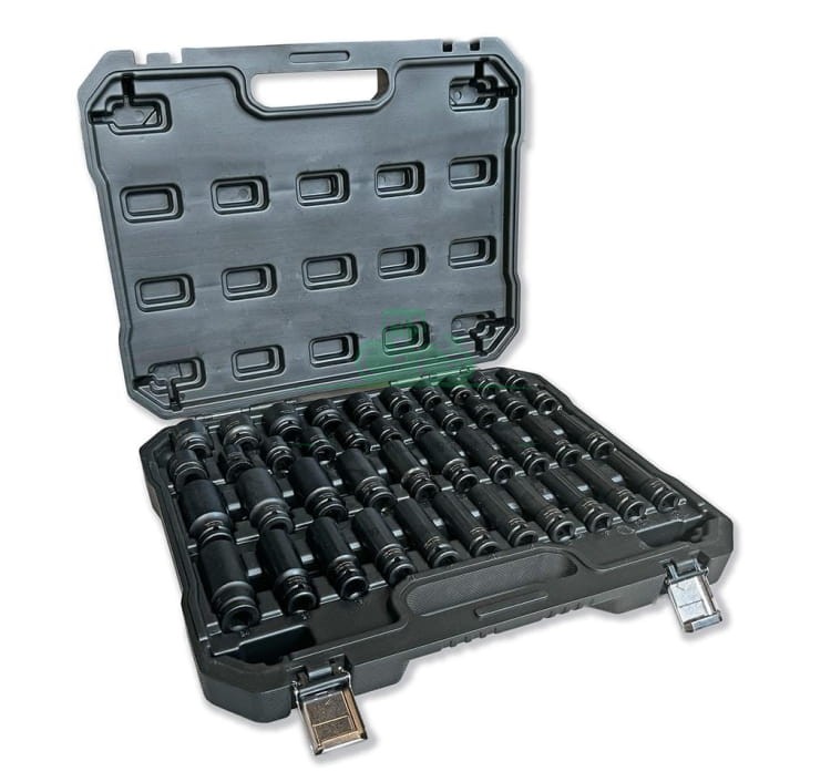 Rozmiary nasadek calowych przedłużonych w zestawie: 3/8", 1/2", 9/16", 5/8", 3/4", 13/16", 15/16", 1", 1-1/16" & 1-1/18"